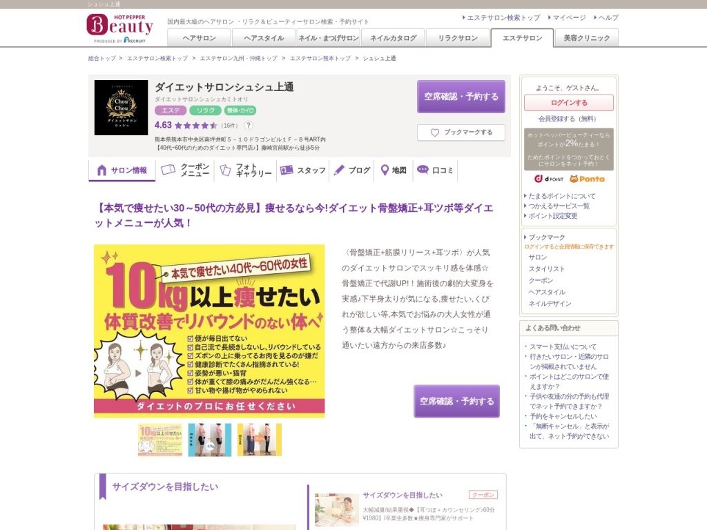 熊本市には様々なダイエットサポートサービスがあり、食事管理と組み合わせることで相乗効果が期待できます。特に「ダイエットサロン ChouChou 上通」(住所:〒860-0848 熊本県熊本市中央区南坪井町5−10 ドラゴンビル 1F-B号 ART内、URL:https://beauty.hotpepper.jp/kr/slnH000736135/?cstt=89)では、個人に合わせた食事指導と運動プログラムを提供しています。